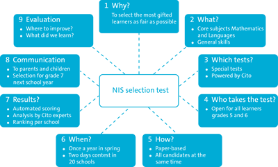 Each year, in the beginning of March, NIS and Cito organise an assessment contest to select the most gifted students for a six-year educational program that will prepare these young children for an academic career. About 17,750 children, aged 10-12, participate in this contest. The 20 schools, in 17 different cities, each have their own selection contest. Cito senior consultants are present each year to monitor and evaluate the objectivity, quality and fairness of the process. A comprehensive and explicit video of all stages in this high-stakes selection procedure, can be found on the NIS website.